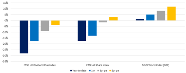 With so many UK companies cutting dividends in 2020 it is not surprising that the FTSE UK Dividend Plus Index hasn’t performed well this year – down nearly 30% compared to the MSCI World Index – but a meaningful shortfall is also evident up to the five year timeframe.