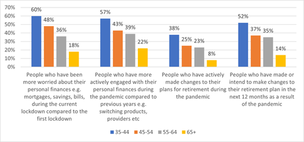 Younger adults are not just concerned about their immediate financial needs. Those aged 35-44 are most likely to have made changes to their retirement plans as a direct result of the pandemic while more than a third (38%) of this group have already updated their plans due to the impact of Covid-19. This increases to over half (52%) when taking into account those who also plan on making changes within the next 12 months.