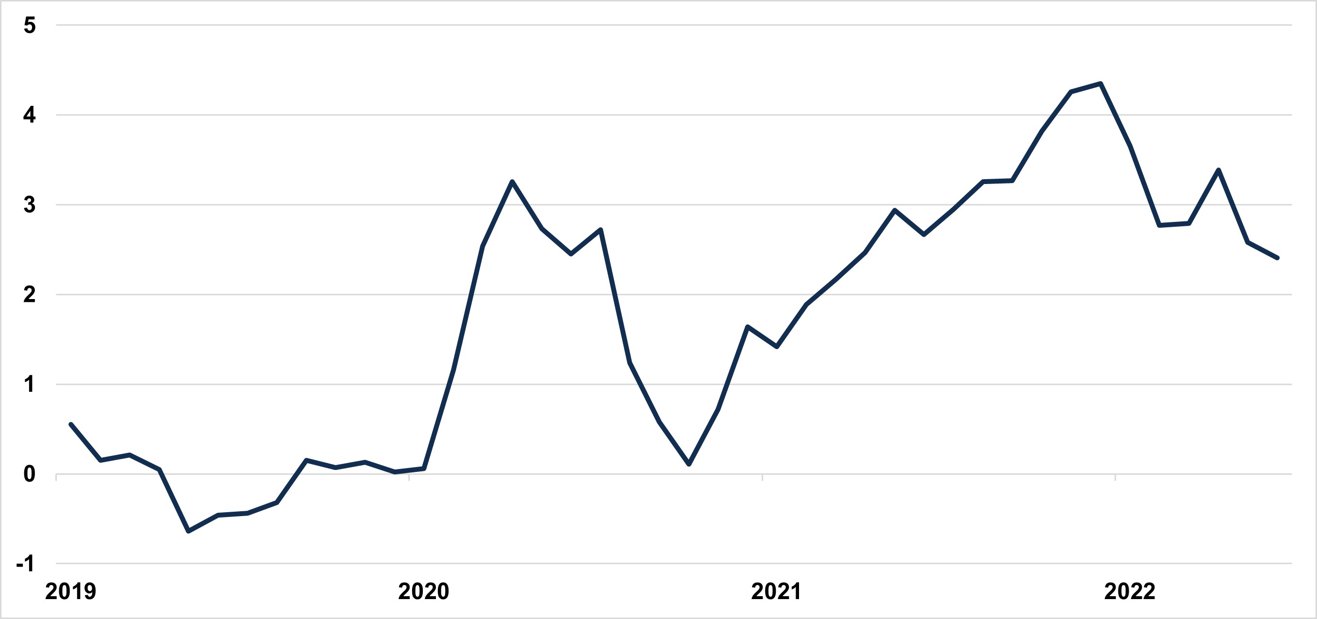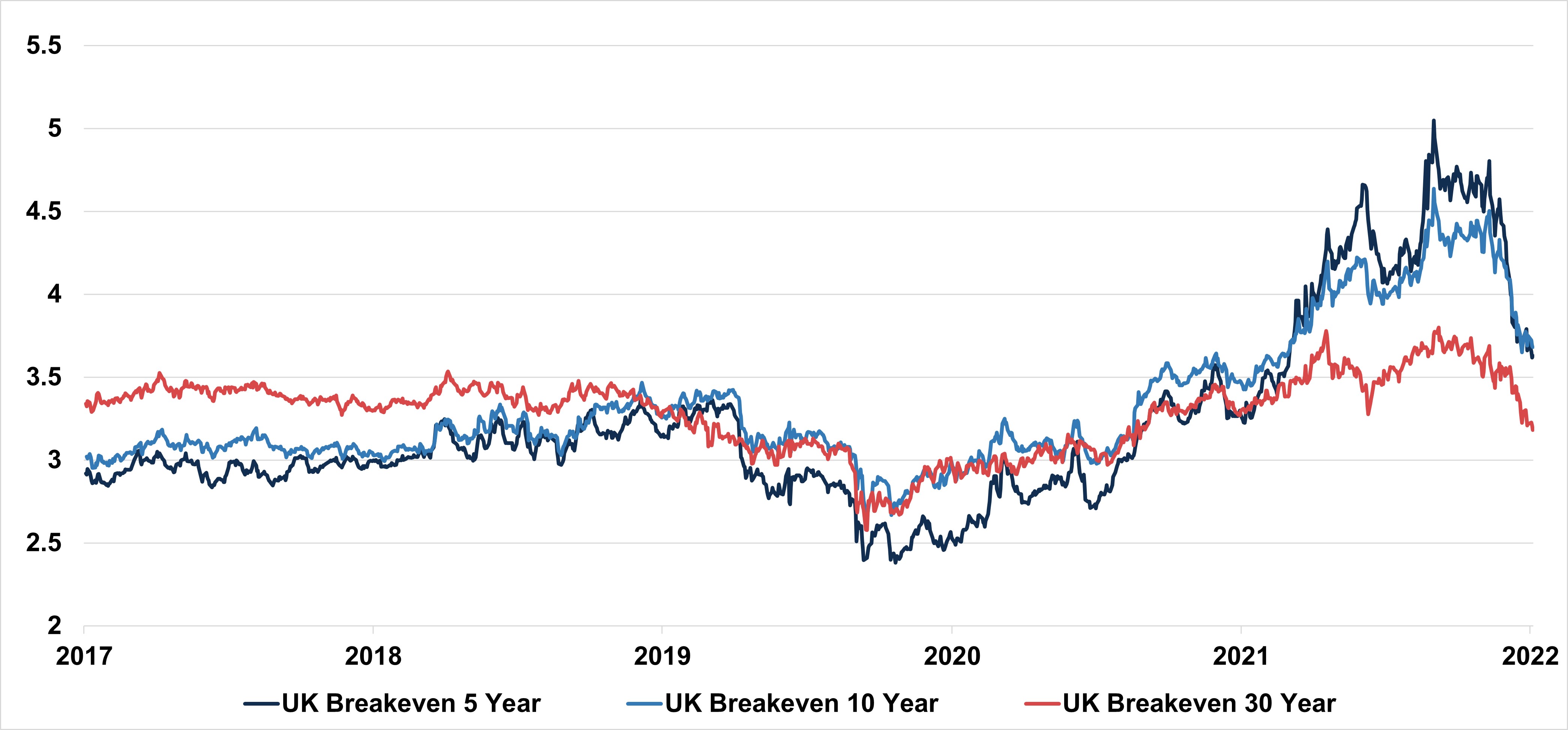 However, there may be cause for some optimism. Markets are saying inflationary pressures will no longer be such a concern in the future. This can be seen in the graph below showing UK breakeven inflation rates¹ (implied future inflation rates) coming down significantly since the middle of June. The same is true of breakeven data in the US.