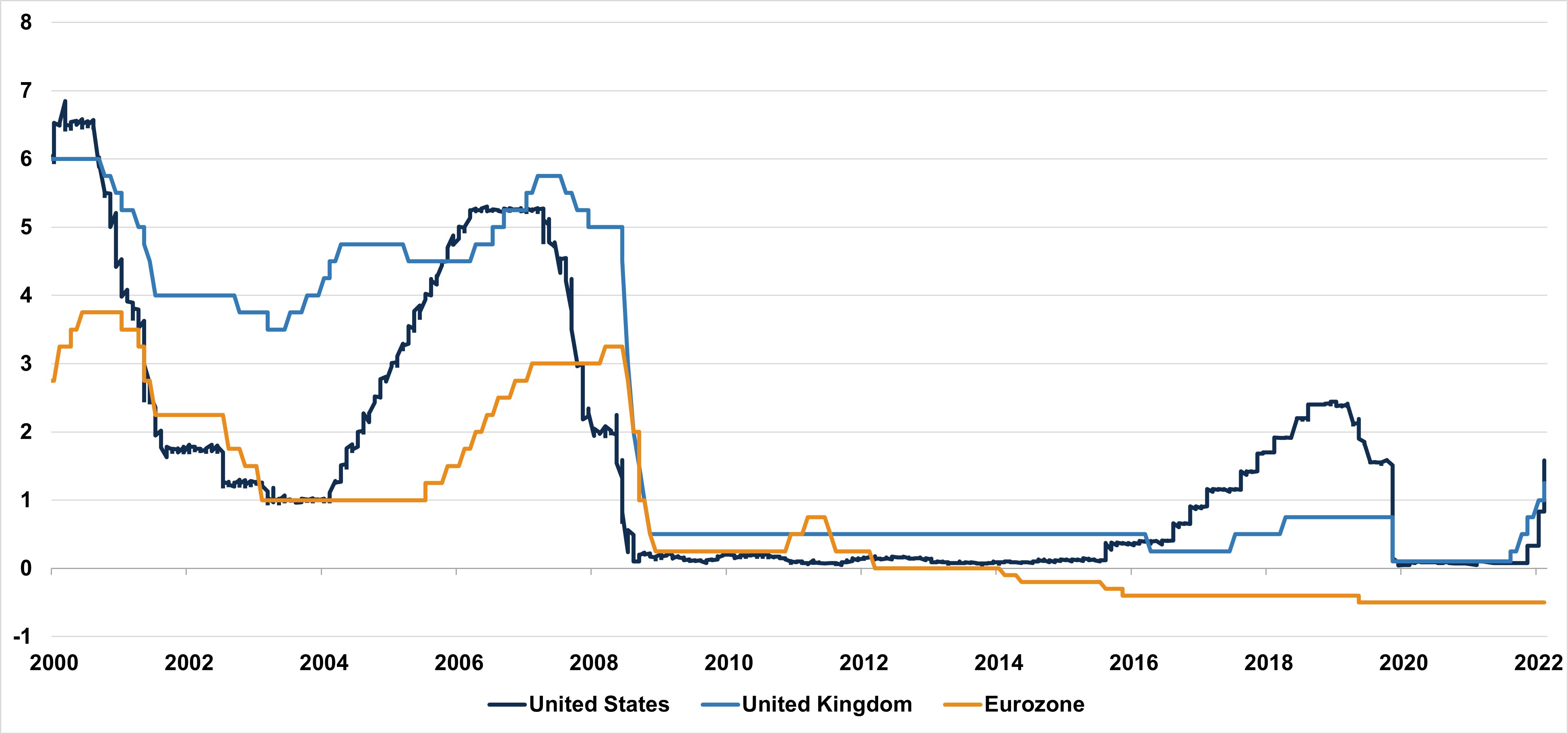 The US Federal Reserve (the Fed) was slower in starting to raise rates, but is now going for larger rate hikes, with the last being a 75-basis points hike taking the federal funds rate to 1.5%. Again, further rises are a certainty.