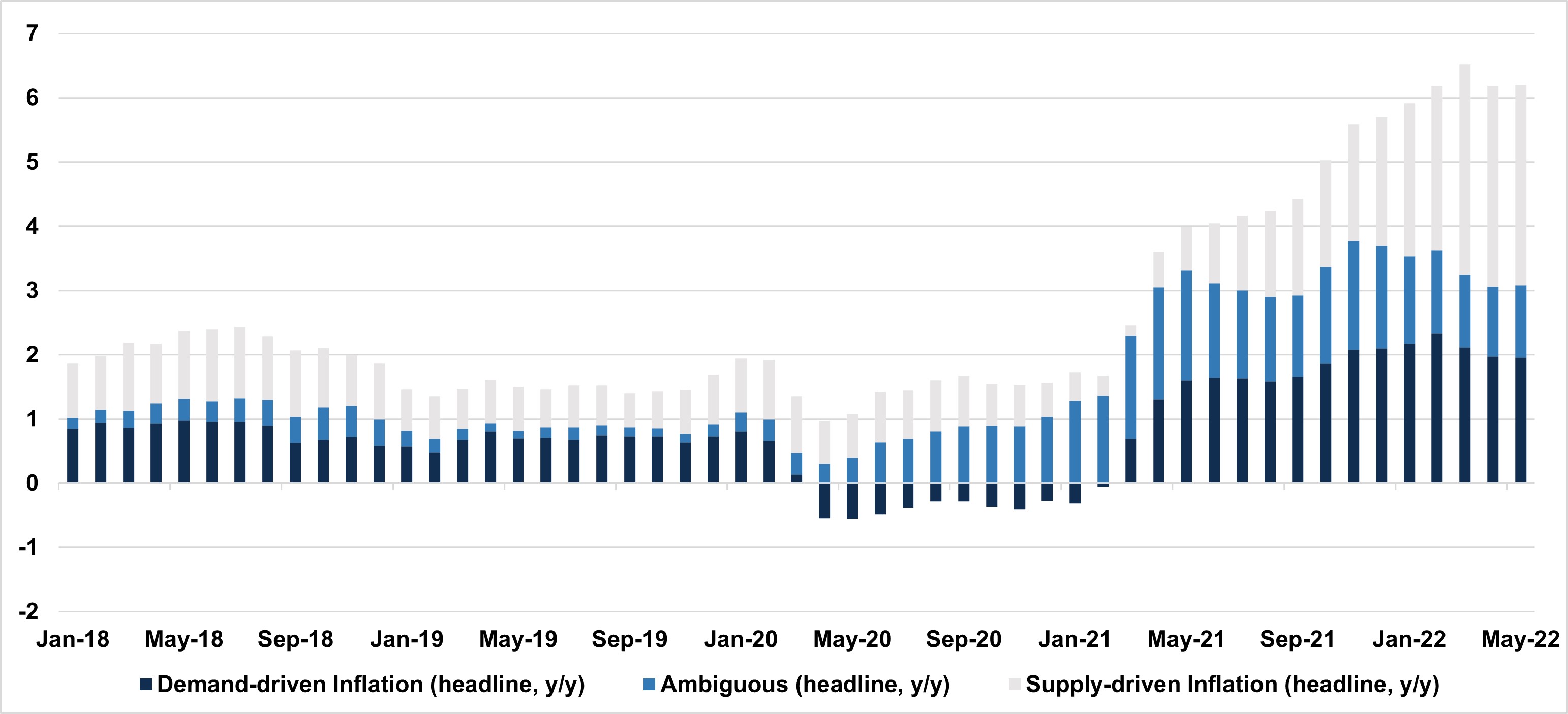As you can see from the graph below, in May roughly 2% of the 6.3% headline PCE (personal consumption expenditures) in the US is as a result of demand-driven factors. Around 3.1% is supply driven while about 1.1% is ambiguous. Given that only 2%, or less than one third, of headline PCE inflation can be targeted by central banks, they will have to decimate demand to bring inflation down to anywhere near the 2% mark.