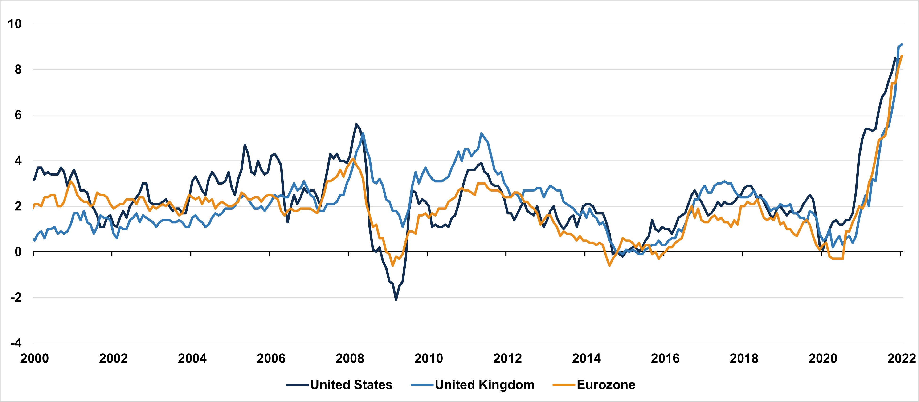 Inflation has hit multi-decade highs across much of the developed world. Initially, the broad market consensus was that inflation would be transitory – it was only rising as a result of extremely low year-on-year base effects. These were a result of low demand and energy prices crashing in 2020 following the first Covid lockdowns. The hypothesis was this would simply pass-through when these low base effects were no longer impacting inflation figures. The consensus was emphatically incorrect.