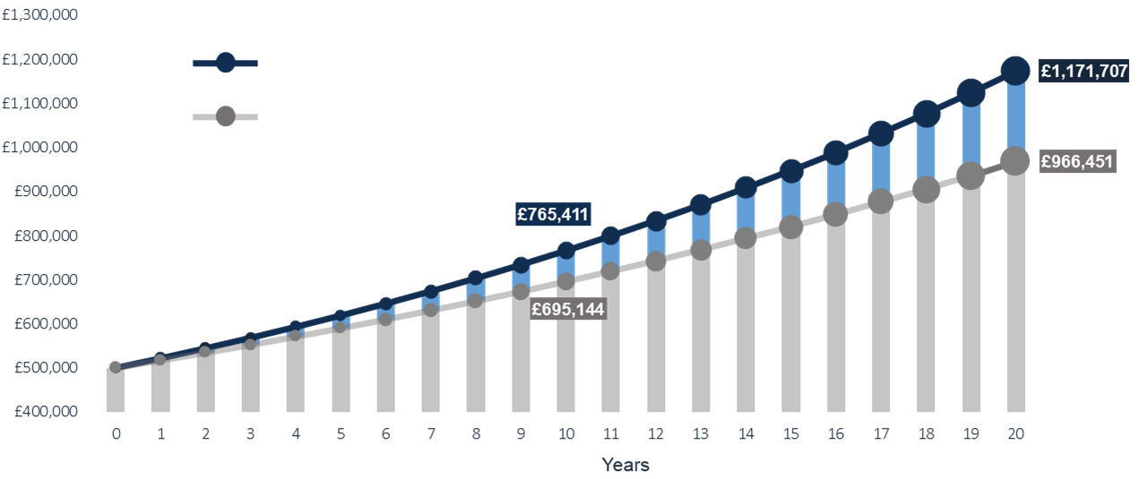 This outsized impact from a seemingly miniscule effect is no anomaly, and can be evidenced in the world of investing, too. For example, a 1% difference in overall fees (between 0.65% and 1.65%) has a significant impact over time – boosting a £500,000 portfolio by around £70,000 in 10 years and by over £205,000 in 20 years.