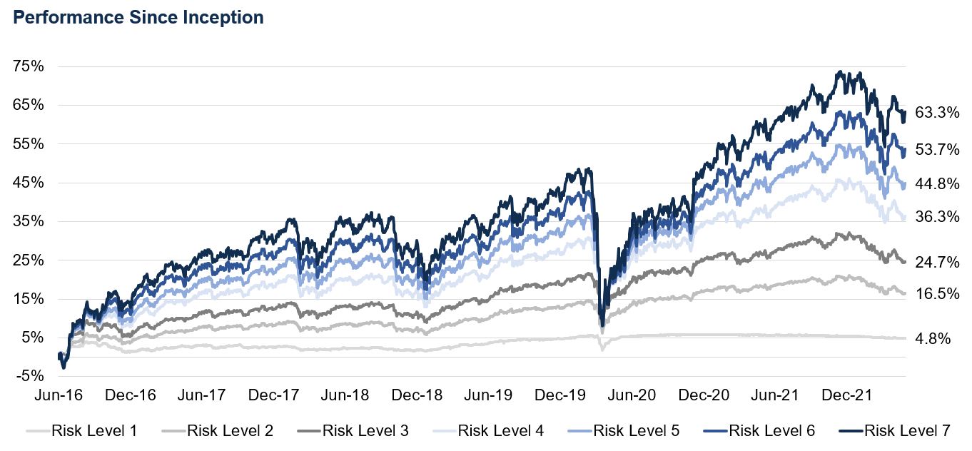 Returns shown are of indicative live portfolios in each Risk Level, using the market prices at which purchases and sales took place. Returns are shown net of (i) all charges associated with the underlying fund investments and (ii) a Netwealth fee of 0.35% per annum covering management, trading, custody and administration charges. Netwealth fees range from 0.65% - 0.35% pa depending on account size. The data shown is from inception in May 2016 and as such there is no data available for prior periods.