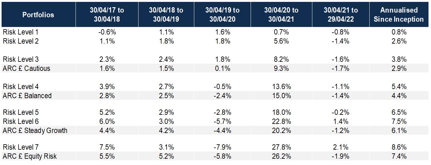 Netwealth GBP portfolios 12 month returns (as at 30th April 2022)