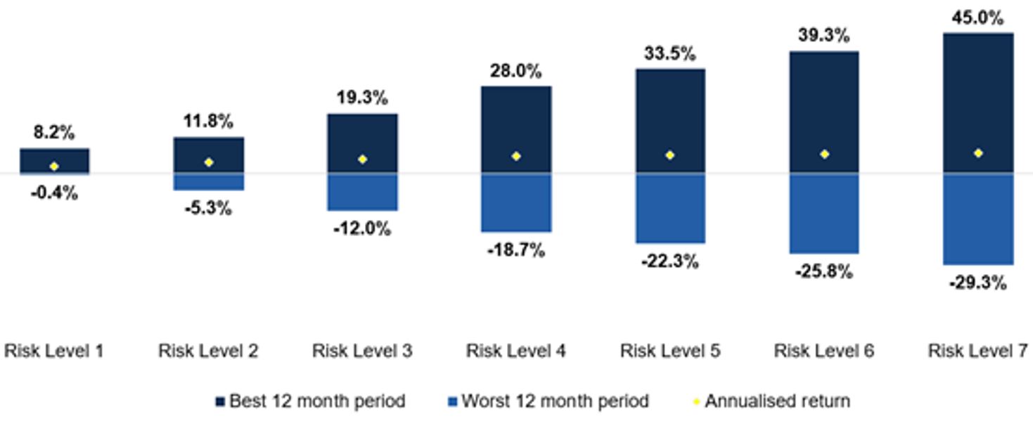 It's important to note, therefore, that even though there will be periods of market stress (most likely every year), taking investment risk over the long term is typically rewarded. The chart below shows that returns can be weak at times (the light blue bars show what would have happened in the past, and thus is likely to occur again), but it is the average return through time that matters, and remaining calm and invested according to your chosen risk level – unless your circumstances or objectives have changed.